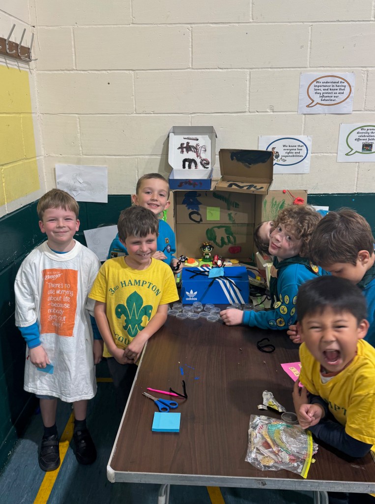 In true scouting-style, the children got stuck in! They used cardboard boxes, felt, modelling clay, paint and anything they could lay their hands on at HQ to build these miniature worlds, and were very happy and proud of what they produced. Lots of smiling faces!
